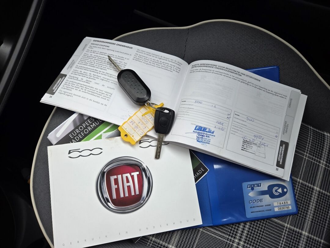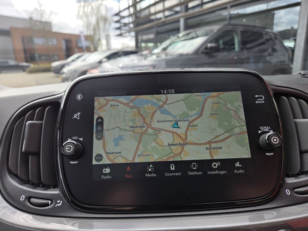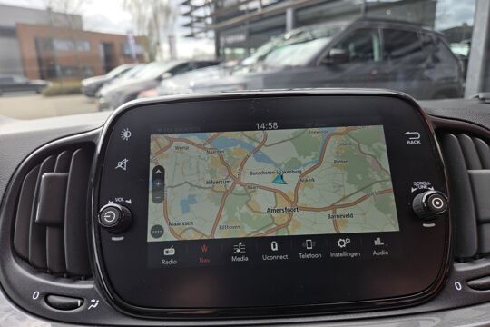 Deze Fiat is voorzien van knoppen op het stuur om het full map navigatiesysteem en het audiosysteem met DAB-ontvangst te bedienen. Omdat je nu eenmaal niet overal ogen hebt, is deze Fiat 500 voorzien van een achteropkomend verkeer waarschuwing die registreert wanneer de afstand tot je achterligger te krap is. Inparkeren en uitparkeren kost geen enkele moeite dankzij de parkeersensoren. De cruise control levert een mooie, gelijkmatige koers. Dat rijdt prettig. Met de ingebouwde airconditioning zit jij altijd ontspannen achter het stuur. Deze auto is voorzien van lederen stuur, centrale deurvergrendeling met afstandsbediening en boordcomputer.