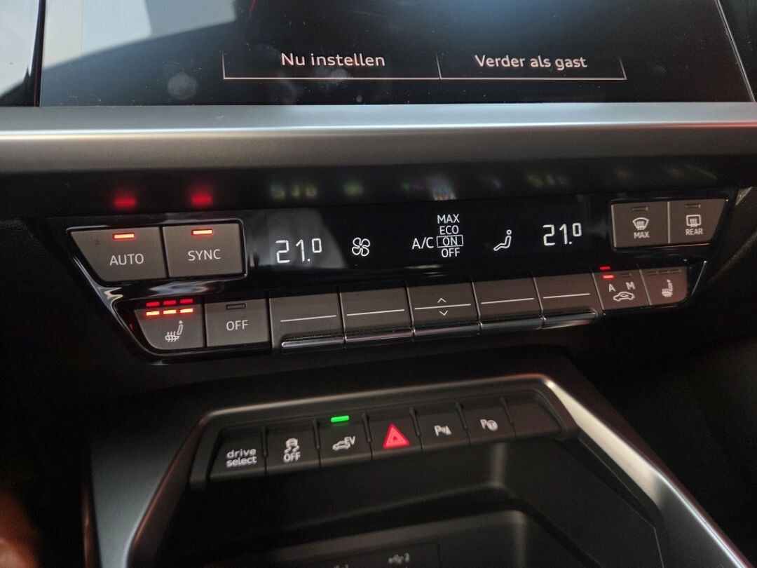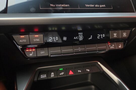 Zoals je mag verwachten van deze Audi A3 Sportback is hij uitgerust met een reeks aan actieve veiligheidssystemen. Bij de veiligheidssystemen van deze auto hoort ook de verkeersbord-detectie. Die leest tijdens het rijden als het ware met je mee en attendeert je op de significante verkeersborden langs en boven de weg. Een camera houdt de juiste koers binnen de rijstrook in de gaten en het Lane-keeping systeem corrigeert bij afwijkingen. Het systeem van forward collision warning, of in gewoon Nederlands 'botswaarschuwing', treedt in werking als de sensor te weinig afstand signaleert met een voor- of tegenligger. Verder is deze auto uitgerust met Abs - anti blokkeer systeem met brake assistant en bandenspanningcontrolesysteem.